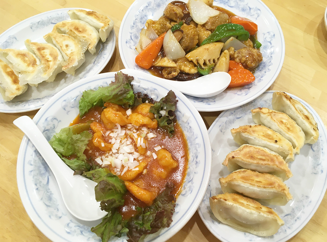館内レストラン「ぎょうざの満洲」では、「エビのチリソース煮」や「酢豚」など東明館独自のメニューもご用意しています。